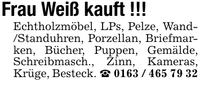 Frau Weiß kauft !!!Echtholzmöbel, LPs, Pelze, Wand- /Standuhren, Porzellan, Briefmarken, Bücher, Puppen, Gemälde, Schreibmasch., Zinn, Kameras, Krüge, Besteck. _ ***
