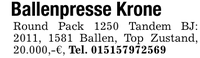 Ballenpresse KroneRound Pack 1250 Tandem BJ: 2011, 1581 Ballen, Top Zustand, 20.000,-€, Tel. ***