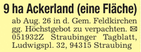 9 ha Ackerland (eine Fläche)ab Aug. 26 in d. Gem. Feldkirchen gg. Höchstgebot zu verpachten. _ ***Z Straubinger Tagblatt, Ludwigspl. 32, 94315 Straubing
