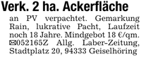 Verk. 2 ha. Ackerflächean PV verpachtet. Gemarkung Rain, lukrative Pacht, Laufzeit noch 18 Jahre. Mindgebot 18 €/qm. _***Z Allg. Laber-Zeitung, Stadtplatz 20, 94333 Geiselhöring
