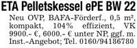 ETA Pelletskessel ePE BW 22Neu OVP, BAFA-Förderf., 0,5 m², kompakt, 104% effizient, VK 9900.- €, 6000.- € unter NP, ggf. m. Inst.-Angebot; Tel. ***