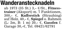 Wanderanstecknadelnab 1973 (35 St.) 3,- €/St., Fitnesstrainer (Aksport) m. 7 Funktionen, 300,- €, Kufferstich (Straubing) auf Holz, 40,- €, Spiegel o. Rahmen (L: 2m, B: 1 m) 20,- €, Gasofen f. Garage 30,-€, Tel. ***