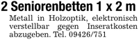2 Seniorenbetten 1 x 2 mMetall in Holzoptik, elektronisch verstellbar gegen Inseratkosten abzugeben. Tel. ***