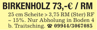 BIRKENHOLZ 73,-€ / RM25 cm Scheite > 3,75 RM (Ster) RF ~ 15%. Nur Abholung in Boden 4 b. Traitsching. _ ***