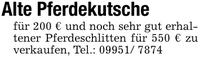 Alte Pferdekutsche für 200 € und noch sehr gut erhaltener Pferdeschlitten für 550 € zu verkaufen, Tel.: ***