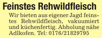 Feinstes RehwildfleischWir bieten aus eigener Jagd feinstes Rehwildfleisch, vakuumiert und küchenfertig. Abholung nähe Adlkofen. Tel: ***