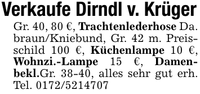 Verkaufe Dirndl v. KrügerGr. 40, 80 €, Trachtenlederhose Da. braun/Kniebund, Gr. 42 m. Preisschild 100 €, Küchenlampe 10 €, Wohnzi.-Lampe 15 €, Damenbekl.Gr. 38-40, alles sehr gut erh. Tel. ***