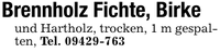 Brennholz Fichte, Birkeund Hartholz, trocken, 1 m gespalten, Tel. ***