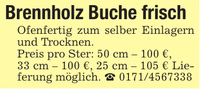 Brennholz Buche frisch Ofenfertig zum selber Einlagern und Trocknen. Preis pro Ster: 50 cm - 100 €, 33 cm - 100 €, 25 cm - 105 € Lieferung möglich. _ ***