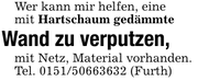 Wer kann mir helfen, einemit Hartschaum gedämmteWand zu verputzen,mit Netz, Material vorhanden.Tel. *** (Furth)