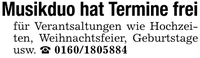 Musikduo hat Termine freifür Verantsaltungen wie Hochzeiten, Weihnachtsfeier, Geburtstage usw. _ ***