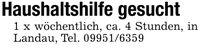 Haushaltshilfe gesucht1 x wöchentlich, ca. 4 Stunden, in Landau, Tel. ***