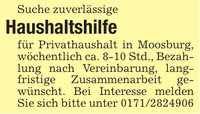 Suche zuverlässigeHaushaltshilfefür Privathaushalt in Moosburg, wöchentlich ca. 8-10 Std., Bezahlung nach Vereinbarung, langfristige Zusammenarbeit gewünscht. Bei Interesse melden Sie sich bitte unter ***