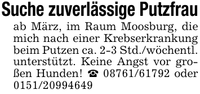 Suche zuverlässige Putzfrauab März, im Raum Moosburg, die mich nach einer Krebserkrankung beim Putzen ca. 2-3 Std./wöchentl. unterstützt. Keine Angst vor großen Hunden! _ *** oder ***