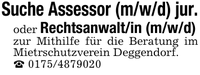 Suche Assessor (m/w/d) jur.oder Rechtsanwalt/in (m/w/d)zur Mithilfe für die Beratung im Mietrschutzverein Deggendorf._ ***