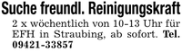 Suche freundl. Reinigungskraft2 x wöchentlich von 10-13 Uhr für EFH in Straubing, ab sofort. Tel. ***