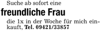 Suche ab sofort eine freundliche Fraudie 1x in der Woche für mich einkauft, Tel. ***
