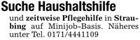 Suche Haushaltshilfeund zeitweise Pflegehilfe in Straubing auf Minijob-Basis. Näheres unter Tel. ***