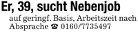 Er, 39, sucht Nebenjob auf geringf. Basis, Arbeitszeit nach Absprache _ ***