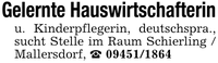 Gelernte Hauswirtschafterinu. Kinderpflegerin, deutschspra., sucht Stelle im Raum Schierling / Mallersdorf, _ ***