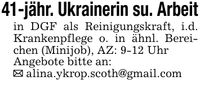 41-jähr. Ukrainerin su. Arbeit in DGF als Reinigungskraft, i.d. Krankenpflege o. in ähnl. Bereichen (Minijob), AZ: 9-12 Uhr Angebote bitte an: _ alina.ykrop.scoth@gmail.com