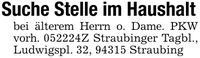 Suche Stelle im Haushaltbei älterem Herrn o. Dame. PKW vorh. ***Z Straubinger Tagbl., Ludwigspl. 32, 94315 Straubing