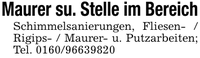 Maurer su. Stelle im BereichSchimmelsanierungen, Fliesen- / Rigips- / Maurer- u. Putzarbeiten; Tel. ***