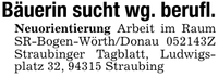 Bäuerin sucht wg. berufl.Neuorientierung Arbeit im Raum SR-Bogen-Wörth/Donau ***Z Straubinger Tagblatt, Ludwigsplatz 32, 94315 Straubing