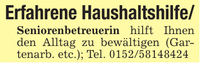 Erfahrene Haushaltshilfe/Seniorenbetreuerin hilft Ihnen den Alltag zu bewältigen (Gartenarb. etc.); Tel. ***