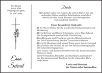 Was bleibt, wenn alles Vergängliche geht, ist die Liebe Erna Schneil Danke Wir danken allen von Herzen, die sich in Trauer mit uns verbunden fühlen und ihre Anteilnahme persönlich, schriftlich oder durch Blumen- und Messspenden zum Ausdruck brachten. Unser besonderer Dank gilt: - H. H. Pfarrer Weber für die würdevolle Eucharistiefeier und Beisetzung - Herrn Krinner und Herrn Schormann, sowie Frau Schenk für die ergreifende musikalische Umrahmung - Frau Hermann und Frau Muhr mit den Ministrantinnen für Ihre Unterstützung bei den Trauerfeierlichkeiten - Herrn Dr. Murmann und seinem Team, sowie den Ärzten und Mitarbeitern der Station 32 und der Palliativversorgung für ihr liebevolles Engagement - dem Hasen- und Kameradschaftsverein für die persönlichen Worte am Grab - allen Verwandten, Freunden und Nachbarn, insbesondere der Dorfgemeinschaft Riedling für die tröstenden Worte und Gesten Lucia und Susanne im Namen aller Verwandten