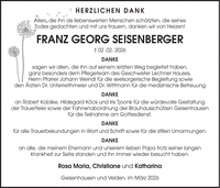 Herzlichen Dank Allen, die ihn als liebenswerten Menschen schätzten, die seines Todes gedachten und mit uns trauern, danken wir von Herzen! FRANZ GEORG SEISENBERGER + 02 .02. 2026 DANKE sagen wir allen, die ihn auf seinem letzten Weg begleitet haben, ganz besonders dem Pflegeteam des Geschwister Lechner Hauses, Herrn Pfarrer Johann Weindl für die seelsorgerische Begleitung sowie den Ärzten Dr. Unterreithmeier und Dr. Wittmann für die medizinische Betreuung. DANKE an Robert Kobilke, Hildegard Köck und Iris Tjoonk für die würdevolle Gestaltung der Trauerfeier sowie der Fahnenabordnung der Brauhausschützen Geisenhausen für die Teilnahme am Gottesdienst. DANKE für alle Trauerbekundungen in Wort und Schrift sowie für die stillen Umarmungen. DANKE an alle, die meinem Ehemann und unserem lieben Papa trotz seiner langen Krankheit zur Seite standen und ihn immer wieder besucht haben. Rosa Maria, Christiane und Katharina Geisenhausen und Velden, im März 2026