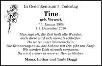 In Gedenken zum 5. Todestag Tine geb. Vorwerk * 1. Januar 1984 _ 1. Dezember 2020 Man sagt oft, die Zeit heilt alle Wunden, doch diese wird sich niemals schließen. Du warst unser Sonnenschein. Die Erinnerung an all das Schöne mit Dir, gibt uns Kraft. Wir werden Dich niemals vergessen. Du wirst immer in unseren Herzen bleiben. Mama, Lothar und Tante Daggi