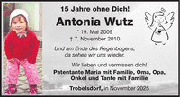 15 Jahre ohne Dich! Antonia Wutz * 19. Mai 2009 + 7. November 2010 Und am Ende des Regenbogens, da sehen wir uns wieder. Wir lieben und vermissen dich! Patentante Maria mit Familie, Oma, Opa, Onkel und Tante mit Familie Trobelsdorf, in November 2025