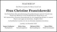 NACHRUF Die Pfarrei Landau St. Maria trauert um Frau Christine Franziskowski Die Verstorbene übte jahrzehntelang mit großem Einsatz und mit Umsicht den Dienst der Mesnerin in der Friedhofskirche Heilig Kreuz aus. Wir danken Frau Christine Franziskowski für ihr langjähriges Wirken in unserer Pfarrei und sagen ein herzliches 'Vergelt's Gott'. In Dankbarkeit werden wir ihr ein ehrendes Andenken bewahren. Landau, im Dezember 2025 August Lindmeier Tobias Denz Michaela Piller Simon Piller Stadtpfarrer Verwaltungsleiter Kirchenpflegerin PGR-Vorsitzender
