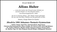 NACHRUF Alfons Huber "... wenn der Lehrer der Freund seiner Schüler ist und die Schüler vor ihm Respekt haben ..." (aus Feuerzangenbowle, 1944) So ist es unserem Alfons "Alf" Huber immer gelungen. Es war uns eine Ehre, Schüler bei ihm gewesen zu sein. Amice, Carpe Diem In Caelis! Absolvia 1991 Johannes-Turmair-Gymnasium Sabine Ammer, Karl Fitz, Christian Fleck, Tanja Franz, Christian Hartmannsgruber, Klaus Liedtke, Dr. Dieter Loibl, Christoph Rehmet, Dr. Andreas Rickauer, Mathias Schill, Christian Schuch, Florian Seiler, Dr. Markus Vogt, Dr. Julia Weigand, Harald Weigert, Hildegunde Weinzierl