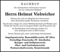 Nachruf Die Aiterhofener Ortsvereine trauern um ihr verdientes Mitglied Herrn Helmut Vielreicher Helmut hat sich als Mitglied der Ortsvereine über Jahrzehnte große Verdienste erworben. Durch seine ruhige Art, seiner Hilfsbereitschaft und Wirken zum Wohle der Vereine war er ein guter Helfer und Freund für alle. In Dankbarkeit und Achtung werden wir sein Andenken stets in Ehre halten. Seiner Familie gilt unser aufrichtige Anteilnahme. Angelsportverein, Bauernhilfsverein, EC Ebra Freiwillige Feuerwehr, FC Aiterhofen Krieger- und Soldatenverein Obst- und Gartenbauverein Partnerschaftsverein, Tennisfreunde