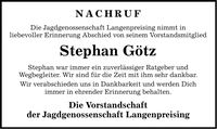 Nachruf Die Jagdgenossenschaft Langenpreising nimmt in liebevoller Erinnerung Abschied von seinem Vorstandsmitglied Stephan Götz Stephan war immer ein zuverlässiger Ratgeber und Wegbegleiter. Wir sind für die Zeit mit ihm sehr dankbar. Wir verabschieden uns in Dankbarkeit und werden Dich immer in ehrender Erinnerung behalten. Die Vorstandschaft der Jagdgenossenschaft Langenpreising