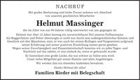 NACHRUF Mit großer Bestürzung und tiefer Trauer nehmen wir Abschied von unserem geschätzten Mitarbeiter Helmut Massinger der im Alter von nur 60 Jahren völlig unerwartet von uns gegangen ist. Helmut war über 12 Jahre hinweg ein unverzichtbarer Teil unseres Tiefbauteams. Als Baggerfahrer und Polier überzeugte er nicht nur durch sein außergewöhnliches Können und Geschick mit den Maschinen, nein, er war auch bei seinen Kollegen und Vorgesetzten aufgrund seiner Erfahrung und seiner positiven Einstellung immer gerne gesehen. Wegen seiner Zuverlässigkeit und Einsatzbereitschaft konnten wir zu jeder Tages- und Nachtzeit auf ihn zählen, er war einfach da, wenn er gebraucht wurde. Er hinterlässt eine große Lücke, die nur schwer zu füllen sein wird. Unser tiefes Mitgefühl gilt seiner Familie und allen Angehörigen. Wir werden ihm ein ehrendes Andenken bewahren. Danke Helmut für alles! Familien Rieder mit Belegschaft