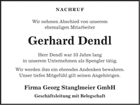 NACHRUF Wir nehmen Abschied von unserem ehemaligen Mitarbeiter Gerhard Dendl Herr Dendl war 33 Jahre lang in unserem Unternehmen als Spengler tätig. Wir werden ihm ein ehrendes Andenken bewahren. Unser tiefes Mitgefühl gilt seinen Angehörigen. Firma Georg Stanglmeier GmbH Geschäftsleitung mit Belegschaft