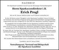NACHRUF Die Sparkasse Landshut trauert um ihr ehemaliges Vorstandsmitglied Herrn Sparkassendirektor i. R. Erich Progl der am 28. Januar 2026 im Alter von 87 Jahren verstorben ist. In den 46 Jahren seiner Tätigkeit in der Sparkasse Landshut, davon 24 Jahre im Vorstand, hat sich Herr Progl mit seiner ganzen Persönlichkeit uneingeschränkt, wegweisend und sehr erfolgreich für das Wohl der Sparkasse Landshut eingesetzt. Er engagierte sich in hohem Maße für die Sparkasse Landshut und hat deren Entwicklung in verschiedenen verantwortlichen Positionen mitgestaltet. 1976 wurde er in den Vorstand der Sparkasse Landshut berufen und war bis zu seinem Eintritt in den Ruhestand verantwortlich für die Region Vilsbiburg. In seine Zeit im Vorstand der Sparkasse Landshut fielen wichtige Veränderungen und Entscheidungen. So hat er mit Weitsicht und besonderem Gespür die Zukunft der Sparkasse Landshut mitgestaltet. Herr Progl wurde wegen seiner Menschlichkeit und Freundlichkeit von allen Mitarbeitenden und Vorstandskollegen sehr geschätzt. Wir werden den Verstorbenen stets in dankbarer, ehrender Erinnerung behalten. Landshut, den 30. Januar 2026 Verwaltungsrat, Vorstand und Belegschaft der Sparkasse Landshut
