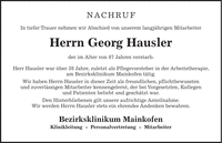 NACHRUF In tiefer Trauer nehmen wir Abschied von unserem langjährigen Mitarbeiter Herrn Georg Hausler der im Alter von 87 Jahren verstarb. Herr Hausler war über 38 Jahre, zuletzt als Pflegevorsteher in der Arbeitstherapie, am Bezirksklinikum Mainkofen tätig. Wir haben Herrn Hausler in dieser Zeit als freundlichen, pflichtbewussten und zuverlässigen Mitarbeiter kennengelernt, der bei Vorgesetzten, Kollegen und Patienten beliebt und geschätzt war. Den Hinterbliebenen gilt unsere aufrichtige Anteilnahme. Wir werden Herrn Hausler stets ein ehrendes Andenken bewahren. Bezirksklinikum Mainkofen Klinikleitung - Personalvertretung - Mitarbeiter