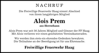 Nachruf Die Freiwillige Feuerwehr Haag nimmt Abschied von ihrem langjährigen Mitglied Alois Prem aus Herrnthann Alois Prem war seit 56 Jahren Mitglied und Gönner der FF Haag. Mit Alois verlieren wir einen geschätzten Vereinskameraden. Wir werden ihm stets ein ehrendes Gedenken bewahren. Die Teilnahme an der Beerdigung ist für uns Ehrensache. Freiwillige Feuerwehr Haag