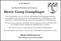 Nachruf Der Markt Pfeffenhausen trauert um Herrn Georg Gumplinger Herr Gumplinger war von 1972 bis 1984 Mitglied des Marktgemeinderats und engagierte sich ehrenamtlich im Pfarrgemeinderat Pfeffenhausen, beim TC Schwarz-Weiß Pfeffenhausen und in der Kolpingsfamilie Pfeffenhausen. Für seine herausragenden Verdienste um das Allgemeinwohl wurde ihm 2023 die Bürgermedaille des Marktes Pfeffenhausen verliehen. Wir danken ihm für seinen Einsatz zum Wohl der Bürgerschaft. Mit aufrichtiger Anteilnahme und in tiefer Verbundenheit gedenken wir ihm. Markt Pfeffenhausen Erster Bürgermeister Florian Hölzl