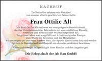 NACHRUF Tief betroffen nehmen wir Abschied von unserer allseits geschätzten Seniorchefin Frau Ottilie Alt Mit Frau Ottilie Alt verlieren wir eine prägende Persönlichkeit, die das Unternehmen über Jahrzehnte mit unermüdlichem Einsatz, Weitblick und menschlicher Wärme mitgeleitet hat. Ihr ganzes Leben war ausgefüllt mit Arbeit und großer Energie zum Wohle des Betriebes und der Mitarbeiter. Wir verneigen uns vor einer starken Frau, die Spuren hinterlassen hat und werden ihr stets in Dankbarkeit und Respekt ein ehrendes Andenken bewahren. Unser aufrichtiges Mitgefühl gilt ihrer Familie und den Angehörigen. Die Belegschaft der Alt Bau GmbH
