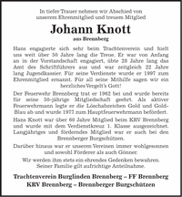 In tiefer Trauer nehmen wir Abschied von unserem Ehrenmitglied und treuem Mitglied Johann Knott aus Brennberg Hans engagierte sich sehr beim Trachtenverein und hielt uns weit über 50 Jahre lang die Treue. Er war von Anfang an in der Vorstandschaft engagiert, übte 28 Jahre lang das Amt des Schriftführers aus und war zeitgleich 22 Jahre lang Jugendkassier. Für seine Verdienste wurde er 1997 zum Ehrenmitglied ernannt. Für all seine Mithilfe sagen wir ein herzliches Vergelt's Gott! Der Feuerwehr Brennberg trat er 1962 bei und wurde bereits für seine 50-jährige Mitgliedschaft geehrt. Als aktiver Feuerwehrmann legte er die Löschabzeichen Gold und Gold-Blau ab und wurde 1977 zum Hauptfeuerwehrmann befördert. Hans Knott war über 60 Jahre Mitglied beim KRV Brennberg und wurde mit dem Verdienstkreuz 1. Klasse ausgezeichnet. Langjähriges und förderndes Mitglied war er auch bei den Brennberger Burgschützen. Darüber hinaus war er unseren Vereinen immer wohlgesonnen und sowohl Förderer als auch Gönner. Wir werden ihm stets ein ehrendes Gedenken bewahren. Seiner Familie gilt aufrichtige Anteilnahme. Trachtenverein Burglinden Brennberg - FF Brennberg KRV Brennberg - Brennberger Burgschützen