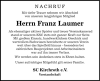 NACHRUfMit tiefer Trauer nehmen wir Abschiedvon unserem langjährigen MitgliedHerrn Franz LaumerAls ehemaliger aktiver Spieler und treuer Vereinskameradstand er unserem KSC stets mit ganzer Kraft zur Seite.Mit großem Einsatz, handwerklichem Geschick undwertvollem Fachwissen bereicherte er unseren Vereinweit über das Spielfeld hinaus - besonders beizahlreichen Bauprojekten und Arbeitseinsätzenwar auf ihn immer Verlass.Wir werden sein Andenken stets in Ehren halten.Unser aufrichtiges Mitgefühl gilt seiner Familie.SC Kirchroth e.V.Vorstandschaft