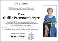 NACHRUF Mit Bestürzung und Trauer erfuhren wir vom plötzlichen Tod unserer Festmutter Frau Ottilie Prommersberger Im Jahr 2001 übernahm sie anlässlich unseres 125-jährigen Gründungsfestes dieses ehrenvolle Amt mit großer Hingabe und Würde. Ihr Engagement, ihre Herzlichkeit und ihre Verbundenheit zu unserem Verein bleiben stets in unserer Erinnerung. In ehrendem Gedenken FF Wetzelsberg Die Vorstandschaft