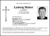 Wir nehmen Abschied von Ludwig Huber aus Adldorf * 6. November 1965 _ 18. November 2025 In stiller Trauer: Franziska, Mutter Elisabeth, Schwester mit Herbert Maria, Schwägerin Anna, Lukas, Johannes und Maria Magdalena, Nichten und Neffen im Namen aller Verwandten Trauergottesdienst am Mittwoch, den 26. November 2025, um 14.30 Uhr in der Pfarrkirche Adldorf. Die Urnenbeisetzung findet im Familienkreis statt. Für alle Zeichen der Anteilnahme danken wir sehr herzlich.
