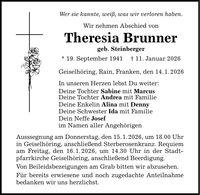 Wer sie kannte, weiß, was wir verloren haben. Wir nehmen Abschied von Theresia Brunner geb. Steinberger * 19. September 1941 _ 11. Januar 2026 Geiselhöring, Rain, Franken, den 14. 1. 2026 In unseren Herzen lebst Du weiter: Deine Tochter Sabine mit Marcus Deine Tochter Andrea mit Familie Deine Enkelin Alina mit Denny Deine Schwester Ida mit Familie Dein Neffe Josef im Namen aller Angehörigen Ausssegnung am Donnerstag, den 15. 1. 2026, um 18.00 Uhr in Geiselhöring, anschließend Sterberosenkranz. Requiem am Freitag, den 16. 1. 2026, um 14.30 Uhr in der Stadtpfarrkirche Geiselhöring, anschließend Beerdigung. Von Beileidsbezeigungen am Grab bitten wir abzusehen. Für bereits erwiesene und noch zugedachte Anteilnahme bedanken wir uns herzlichst.
