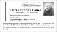 Ganz still und leise, ohne ein Wort, gingst du von uns fort. Hab tausend Dank für deine Müh', vergessen werden wir deiner nie. Herr Heinrich Bauer * 2. Februar 1951 _ 14. Februar 2026 Krumbach, den 25. Februar 2026 In stiller Trauer: Deine Cousinen und Cousin mit Familien im Namen aller Verwandten Sammelrosenkranz und Trauergottesdienst am Freitag, den 27. Februar 2026, um 14.00 Uhr in der Pfarrkirche Pondorf mit anschließender Urnenbeisetzung. Für bereits erwiesene und noch zugedachte Anteilnahme bedanken wir uns recht herzlich.
